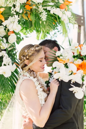 Becca and Adrian's wedding style reflected their wedding vision and honored their unique theme. Adrian wore a traditional maile lei and Becca wore a stunning braid inspired by Rapunzel and Elsa and adorned with celestial hair clips. Becca's wedding dress even had hidden constellations throughout the design, including both her and Adrian's star signs.