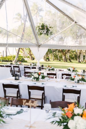 Taking full advantage of the expansive open-aired lawn, the couple added a clear tent so wedding guests could dance under the stars, cozy seating areas under the palm trees, and unique photo-ops like the "ALOHA" lettered sign with the ocean as the backdrop.
