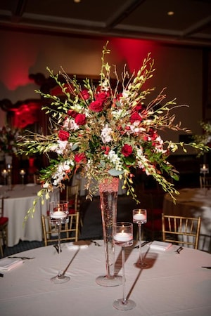 The Great Hall of China was transformed into a space for celebration, from lush floral centerpieces to custom red up lighting that set the ambience.