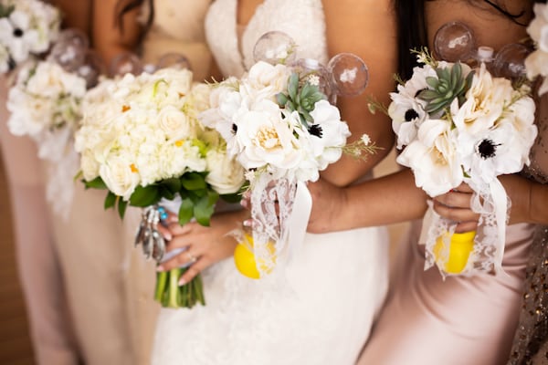 Jena and Scott’s ceremony was full of unique and personal touches – like bubble wand bridal bouquets and a dancing processional. Jena shared that “walking down the iconic blue and gold staircase and being in the Atrium was a surreal moment.”