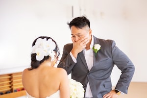 The day started with getting ready with their wedding party inside their Disney Cruise Line stateroom. Followed by the most romantic first look on the deck overlooking the ocean.