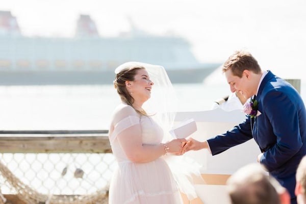 Their wedding day started with getting ready in their stateroom, then boarding a private tram to their Disney wedding venue, Wedding Pointe on Castaway Cay. The secluded dock adds a level of privacy to your wedding event, with the breathtaking backdrop of your Disney Cruise Ship and the clear ocean waters. Their wedding ceremony was full of smiles and laughter, and a little bit of wind.
