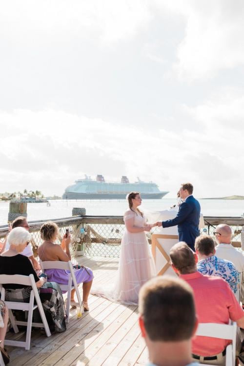Their wedding day started with getting ready in their stateroom, then boarding a private tram to their Disney wedding venue, Wedding Pointe on Castaway Cay. The secluded dock adds a level of privacy to your wedding event, with the breathtaking backdrop of your Disney Cruise Ship and the clear ocean waters. Their wedding ceremony was full of smiles and laughter, and a little bit of wind.