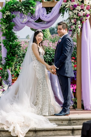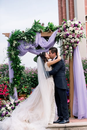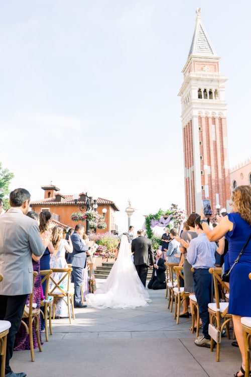 Hosting their Disney Wedding during EPCOT’s Flower and Garden Festival, Italy was already the perfect setting, covered in colorful floral and larger-than-life topiaries. It was a true fairy tale with beautiful ceremony décor in purple hues, with an altar draped in purple silk and custom chairs to match the aesthetic and architecture of the buildings around them. Diana shared that she “remembers feeling so overwhelmed with emotion upon seeing the beauty of their venue, all their loved ones at once and her future husband at the end of the aisle.”