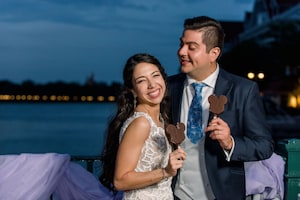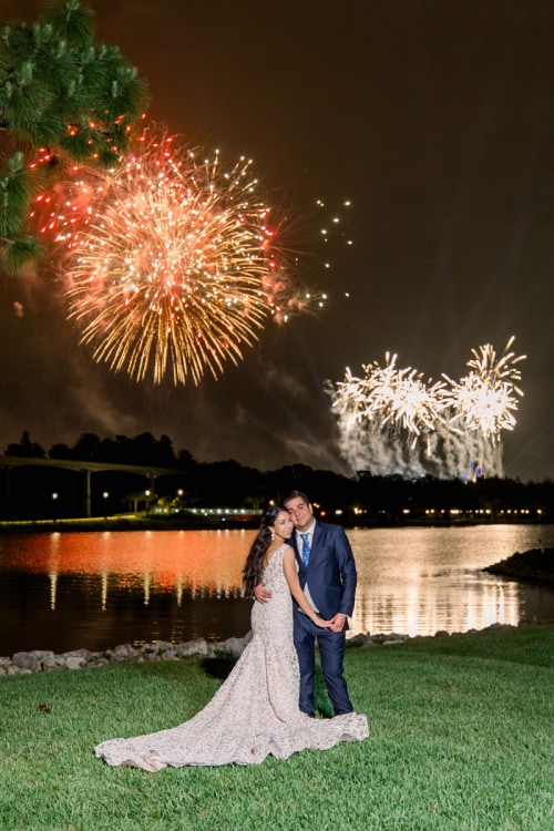 The couple chose to host their wedding ceremony at Italy Plaza in EPCOT, expressing that it was very important for them to “have most of their events inside a theme park or with a unique theme park aspect such as fireworks and characters that our guests could not get at any other wedding venue.”
