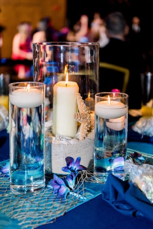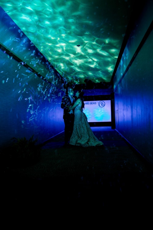 With custom up lighting, themed décor and the salon’s views into the aquarium, their wedding reception felt like “an amazing under the sea party.”