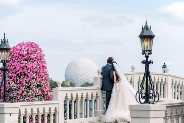 Following their bubble wand exit, Diana and Sixto took advantage of EPCOT’s immersive destinations by taking portraits around the Italy Pavilion before joining their guests at Living Seas Salon in EPCOT Future World for their wedding reception.