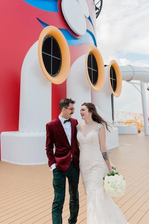 Once everyone was ready, Kristen & Kirk met on Deck 4 for their first look. Kirk shared “I’ll admit I cried when I turned around and saw her for the first time. We shared a moment together and went around to our favorite parts of the ship to get some photos: the Bon Voyage bar next to the atrium was a must, as were the “smokestacks” outside.”