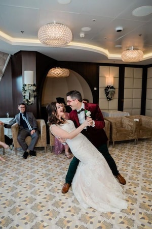 Kirk shared his memory of their wedding ceremony - “as she made her way down the stairs looking like a princess, I teared up again. The ceremony was wonderful, and one of the best parts was being able to share it with others on the ship. The balconies surrounding the atrium were filled with guests who watched our big day. Complete strangers congratulated us throughout the rest of the sailing, and they later shared photos with us of our day.”
