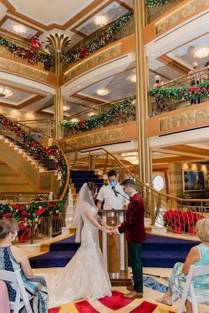 Kirk shared his memory of their wedding ceremony - “as she made her way down the stairs looking like a princess, I teared up again. The ceremony was wonderful, and one of the best parts was being able to share it with others on the ship. The balconies surrounding the atrium were filled with guests who watched our big day. Complete strangers congratulated us throughout the rest of the sailing, and they later shared photos with us of our day.”