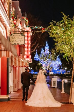 Scott and Anna hosted a Holiday Disney Wedding at Disneyland Resort that combined classic Disney touches with Korean wedding traditions. Taking advantage of the festive season, the couple captured holiday portraits inside Disneyland Park surrounded by Christmas decor.