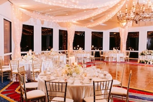Following their wedding ceremony, joined their wedding guests at the Sleeping Beauty Pavilion. The wedding venue was transformed into the same warm Holiday atmosphere with pink and white floral, floating candle centerpieces, and white drape with fairy lights creating a canopy above them.