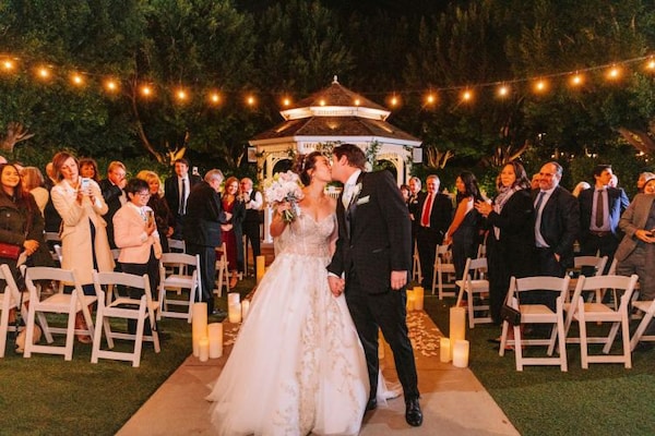 Anna and Scott hosted their wedding ceremony at the Rose Court Garden. The Disney Wedding venue was transformed into a true holiday fairy tale, with stunning floral arrangements adorning the gazebo and aisle, floating candles below and string lights above creating a warm atmosphere. A string quartet brought it all together, adding to the magical ambience.