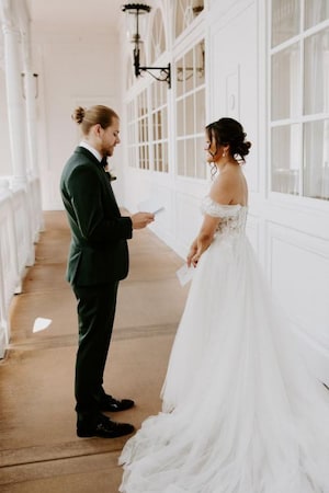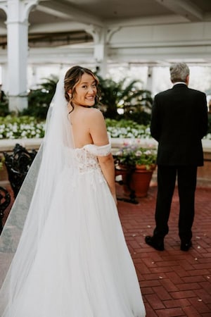 The couple’s wedding day began with a touching first look at Disney’s Grand Floridian Resort & Spa, where Mia and Tim wrote letters to one another and shared an intimate moment before her first look with her father. Having one-on-one wedding day moments with your partner is a current trend we’re seeing that helps couples connect throughout their wedding day.