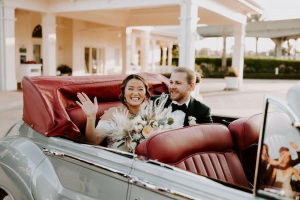 Following their wedding ceremony and a petal toss exit, Mia and Tim rode off as husband and wife in style, in a vintage motorcar that added a touch of glamour to their chic modern fairy tale.