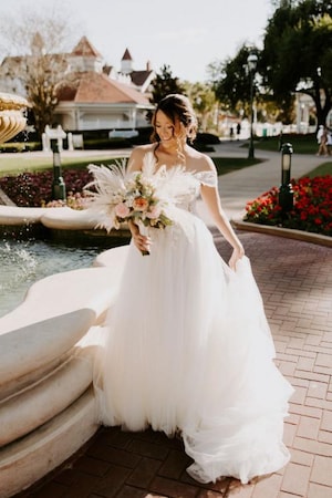 Mia and Tim hosted their wedding ceremony at Walt Disney World’s premier wedding venue – Disney’s Wedding Pavilion. A statement venue itself, the couple enhanced the timeless look of the space with modern bohemian floral to add a pop of style.