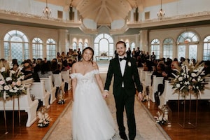 Mia and Tim hosted their wedding ceremony at Walt Disney World’s premier wedding venue – Disney’s Wedding Pavilion. A statement venue itself, the couple enhanced the timeless look of the space with modern bohemian floral to add a pop of style.