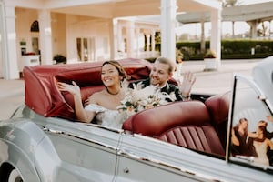 Following their wedding ceremony and a petal toss exit, Mia and Tim rode off as husband and wife in style, in a vintage motorcar that added a touch of glamour to their chic modern fairy tale.