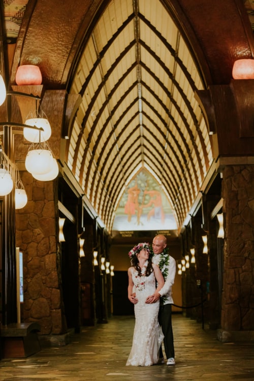 For the wedding reception, the couple and their guests traveled to the Kaiona Ballroom, which is named for a benevolent local mountain goddess who helps the lost find their way home by sending birds to guide them through the forest.