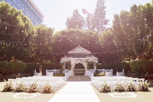 Amanda and Jordan hosted their wedding ceremony inside the Rose Court Garden at The Disneyland Hotel. Surrounded by lush greenery and framed by the delicate beauty of roses in bloom, this secluded venue's focal point is a charming white gazebo. Amanda and John enhanced the natural beauty of the venue by adding blush drapery to the gazebo and had it decorated with floral arrangements.