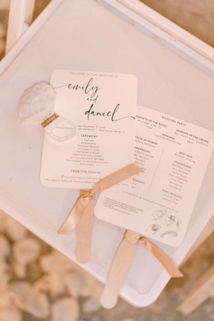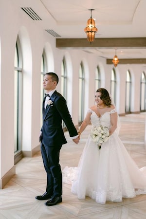 Emily shared that “overall, we wanted a timeless and romantic look for our wedding. After going to the Disney Fairy Tale Wedding showcase in Anaheim (February 2020), we fell in love with a ceremony set up that featured a curved aisle. We knew we had a curved aisle for our own special day and wanted to incorporate whites and creams with touches of gold to add a romantic and classic touch. Disney brought everything we envisioned to life.”