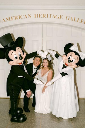Following their wedding ceremony, the couple surprised their guests with a wedding reception at the American Adventure Rotunda in EPCOT. They expressed that “we wanted to share with our guests the magic and fun we felt with Disney and bring them back to their childhood. During our reception, we surprised everyone with an appearance from Minnie and Mickey, Mickey Pretzels and premium bars, and confetti bursts to end the night’s celebration. For us one of our favorite memories that we look back on were the faces of joy and surprise and the screams from everyone of all ages when Mickey and Minnie entered the room.”