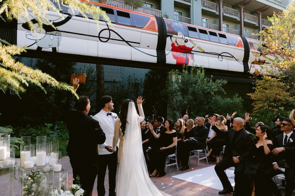The ceremony was adorned with candles, a sleek white aisle, white roses, and the Disneyland Monorail overhead. Emma’s dress, embedded with rhinestones, and Hector’s white tuxedo, juxtaposed with the guests’ all black dress code, adding an elegant level of sophistication and eeriness to the celebration.