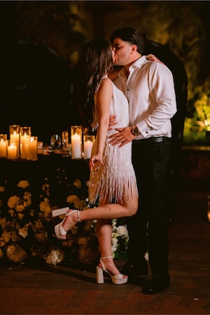 The Disney Weddings team transformed their ceremony space into an elegant reception space. Complete with dozens of glowing candles casting a warm hue across the venue, stunning chandeliers hanging above each table, a vintage inspired three-tiered cake, and a glittering outfit change for the bride, their wedding celebrations were timeless & chic. The couple shared, “It was beautiful and so special to see our vision come to life exactly the way we wanted.”