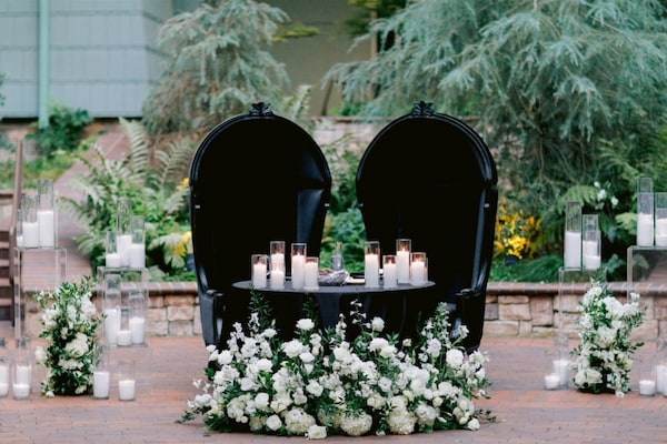 Emma and Hector added touches of fall inspired decor throughout their celebration, such as their “doom buggy” inspired chairs at their sweetheart table as a nod to the ride vehicles on the beloved attraction Haunted Mansion.