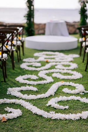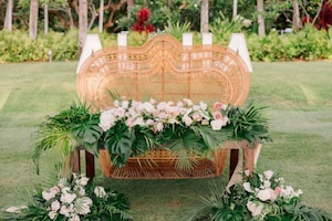 Hosting their wedding ceremony at Lanikuhonua overlooking the ocean, Olive and Rachael immersed their guests in the Hawaiian culture and beautiful island environment by welcoming them with traditional island ukulele music and the blowing of a conch shell. They chose stunning ceremony floral and décor, including a wooden altar arch decorated in palm fronds and an isle lined with custom floral designs.