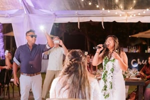 Following their wedding ceremony, the couple and their guests celebrated on the other side of Lanikuhonua under the canopy of tented drape covered in string lights. All elements of their wedding reception reflected their elevated style, with extravagant floral, custom table settings, gold tones, and Hawaiian island touches.