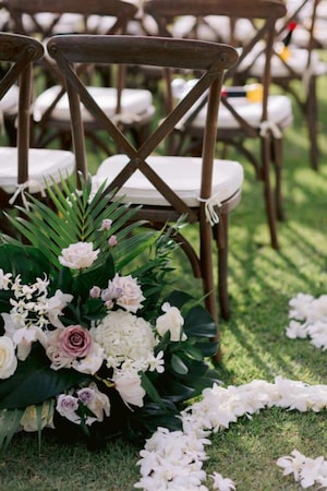 Hosting their wedding ceremony at Lanikuhonua overlooking the ocean, Olive and Rachael immersed their guests in the Hawaiian culture and beautiful island environment by welcoming them with traditional island ukulele music and the blowing of a conch shell. They chose stunning ceremony floral and décor, including a wooden altar arch decorated in palm fronds and an isle lined with custom floral designs.