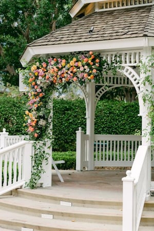 The wedding ceremony space at the Disneyland Hotel Rose Court Garden was transformed into a tropical oasis of palm fronds and roses in shades of pink, orange, and yellow. Vintage string lights lit up the sky above the wedding ceremony, creating a picture-perfect atmosphere.