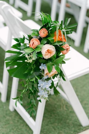 The wedding ceremony space at the Disneyland Hotel Rose Court Garden was transformed into a tropical oasis of palm fronds and roses in shades of pink, orange, and yellow. Vintage string lights lit up the sky above the wedding ceremony, creating a picture-perfect atmosphere.