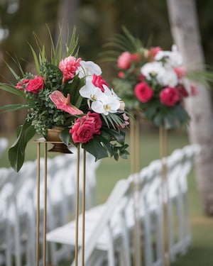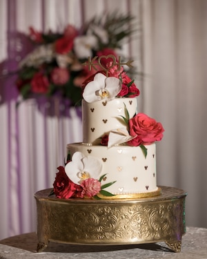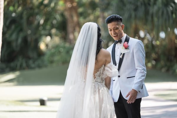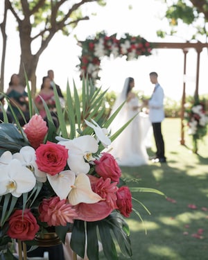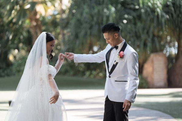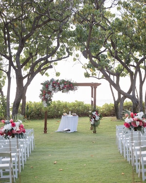 On the morning of their wedding, Krystel got ready in the Lei Hulu suite before sharing a romantic first look with John. Afterwards, the couple walked over to their ceremony on the private beach front of Lanikuhonua. Krystel shared that, "It was important for us to have a custom Disney wedding embracing our Filipino culture and honoring the beautiful Hawaii island.” With this, the couple included tropical details into their decor. Surrounded by lush green grass and bending trees, white chairs lined the grounds. A tall wooden arch decorated with large palms, delicate orchids, and vibrant pink blooms awaited the soon-to-be Mr. And Mrs.