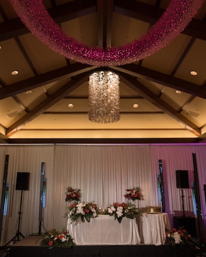 A harpist welcomed John and Krystel’s arrivals. John walked down the aisle to "The Avengers Theme" aed down the aisle to “Kiss The Girl” from The Little Mermaid. During the ceremony, Krystel & John exchanged personal vows, and John added some extra magic into his by incorporating Disney songs. The two partook in a sand ceremony and then walked along the beach to take gorgeous photos along the rocky shores. Krystel and John had their reception at Kaiona Ballroom, named after a local mountain goddess who helps the lost find their way home by sending birds to guide them through the forest. and overhead glass light fixture featured the same bright pink as their ceremony and statement Hawaiian themes were featured throughout the space's decor.