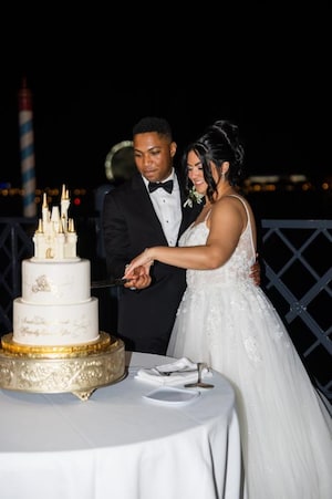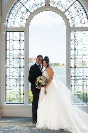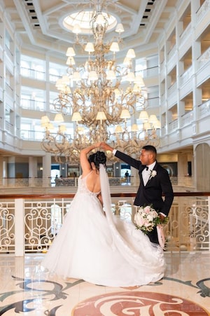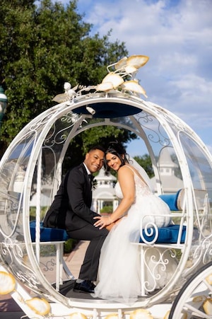 Disney’s Wedding Pavilion was adorned with elegant white and blush florals, matching the bridal bouquets. Jared walked down the aisle in a black suit with a white boutonniere, while Brianna made her grand entrance in true fairy tale fashion, arriving in Cinderella's Coach. The couple walked down the aisle to “Across the Stars” from Star Wars and “I See the Light” from Tangled. “These songs are so special to us, so it was only fitting that we incorporated them into our day!” After their vows, the newlyweds rode away in Cinderella's Coach to continue their evening celebrations.