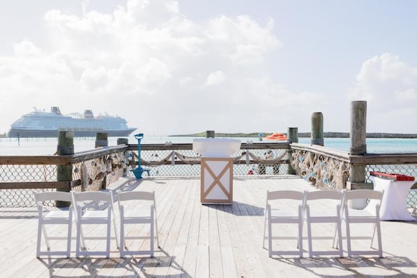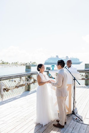 The Wedding Pointe was the perfect island wedding venue for their private wedding ceremony on Castaway Cay. The couple exchanged vows overlooking the crystal blue waters with the Disney Wish Cruise Ship in the distance.