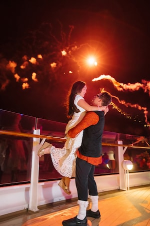 Following their reception, the couple was able to attend more onboard activities with their guests to continue the celebration. Their favorite by far was Pirate Night. Dressing up, seeing the fireworks, and dancing altogether, was the perfect end to the celebration. Erin & Dominic shared that “it felt like an extension of our reception!”