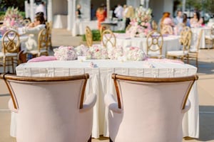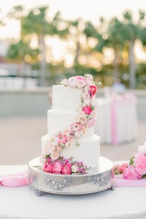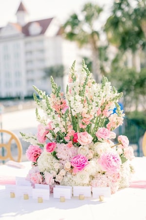“For our day, we wanted a garden party feel to match the theming of The Grand Floridian. I was inspired by Alice in Wonderland to have a whimsical outdoor reception with lots of gorgeous florals and soft touches of pink.”