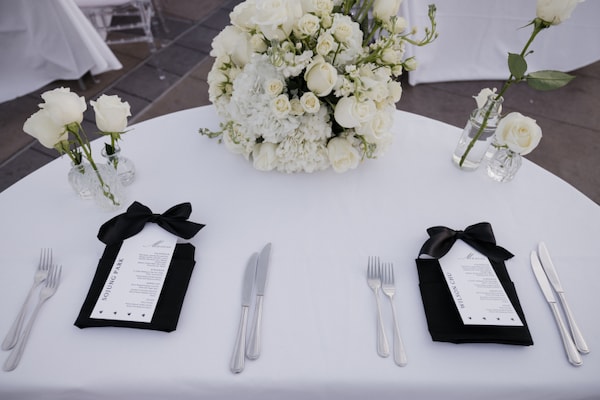 Long tables were decorated with black and white details for a modern, crisp, and elegant look. Chef-crafted dinner options such as Fontina and Spinach Stuffed Chicken were available to guests at dinner stations named after beloved Disney characters like Moana and Mickey Mouse.