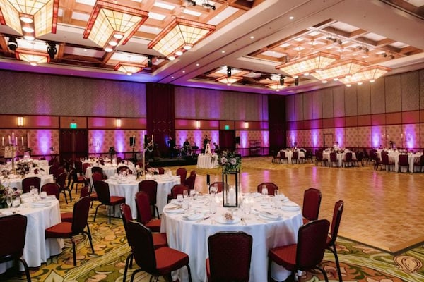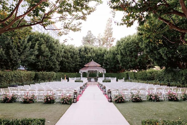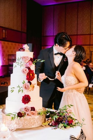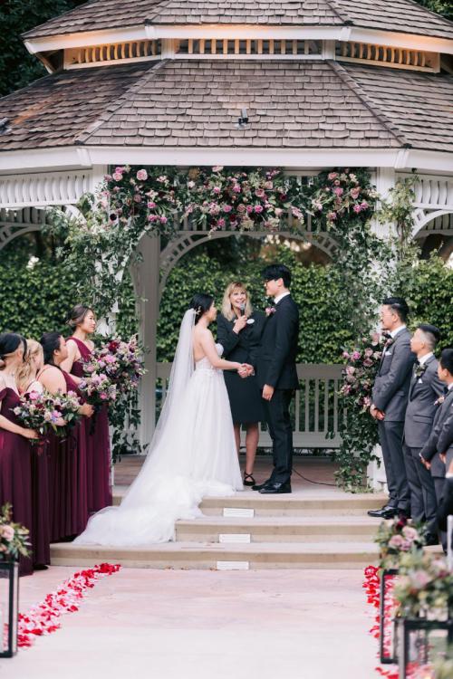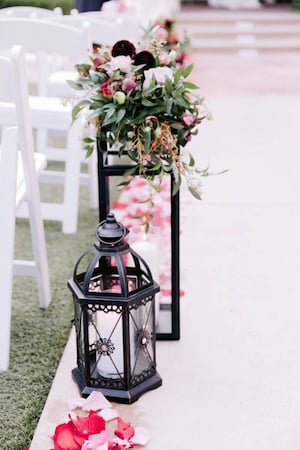 Emily & Justin’s wedding ceremony took place inside the Rose Court Garden at the Disneyland Hotel. This dreamy garden set the scene, while black lanterns lining the aisle, coupled with deep purple and burgundy floral helped to thread their Haunted Mansion theme throughout the ceremony. Creating the perfect balance of elegance and fun!