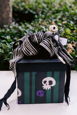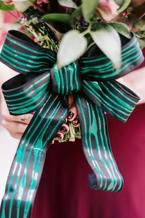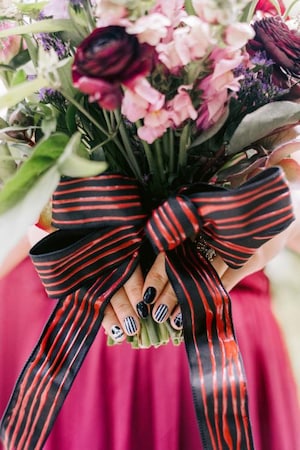 The couple chose a moody aesthetic for their floral and décor, which complimented their wedding theme. Incorporating design elements from the Haunted Mansion and the Nightmare Before Christmas to create an immersive experience. Even the bouquets had nods to the classic Tim Burton film in their ribbons. And of course, even the bridal party’s nails matched the theme!