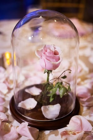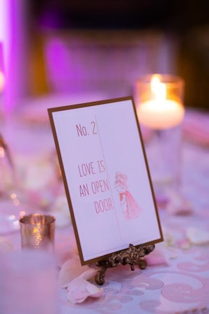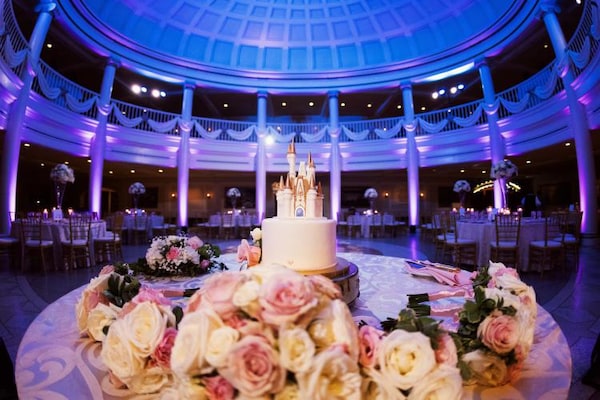 Their theming seamlessly tied into their sophisticated reception at the American Adventure Rotunda. Beautiful floral centerpieces, a castle-topped wedding cake, & Disney Princess-inspired table numbers provided a storybook backdrop to their celebration.