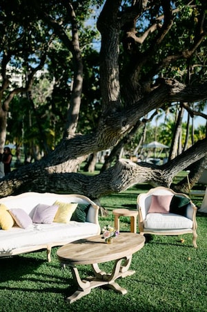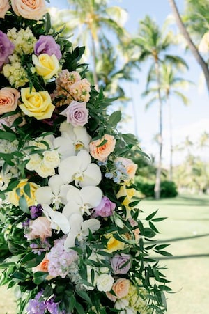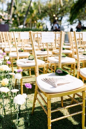 The couple chose the exquisite Lanikuhonua for their "secret garden” theme. Guests arrived at the ceremony in colorful attire that perfectly fit the tropical destination. Other unique ceremony details included intricate custom fans and petal pouches made of palm leaves.
