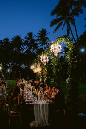 The couple chose the exquisite Lanikuhonua for their "secret garden” theme. Guests arrived at the ceremony in colorful attire that perfectly fit the tropical destination. Other unique ceremony details included intricate custom fans and petal pouches made of palm leaves.
