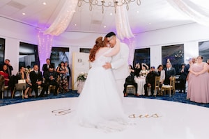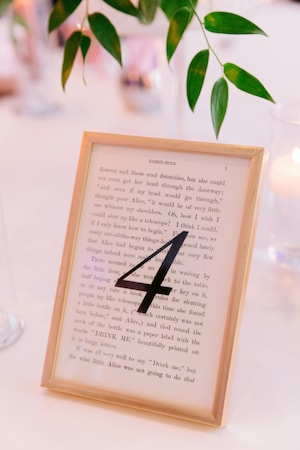 Just steps away, the couple hosted their wedding reception at the Sleeping Beauty Pavilion inside the Disneyland Hotel. The venue was transformed from top-to-bottom. Pink up-lighting and a canopy of fairy lights helped to set the atmosphere. Elevated table décor and a custom dance floor created a romantic scene. There were storybook touches throughout the venue, including pages from Disney stories that served as their table markers, and a life-size storybook set as the backdrop for their sweetheart table.