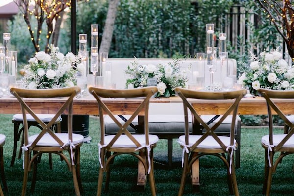 A long elegant, wooded table decorated with green and white florals. Place settings each had a dark wooden chair, a green place napkin, and white floating candles that provided an ethereal ambience to their reception.
