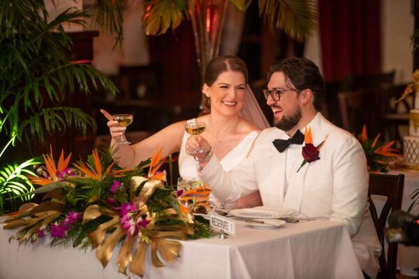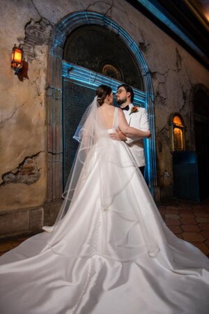 Following their wedding ceremony and keeping with the Old Hollywood theme, the couple hosted their wedding reception at the Brown Derby Restaurant. Dannon shared that “We focused on settled antique attributes, gold/ivory, soft light, glass, and subtle Moroccan influences to bring Rick's Cafe to life. Our party was very intimate with tropical greens and leaning into the dark woods and unique architecture of both the Brown Derby and the courtyard of the Tower of Terror.”