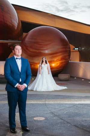 Now more than ever, couples are seeking picture-perfect moments to capture those epic portraits that they can share on social media and display in their homes for years to come. At Walt Disney World there are limitless amount of backdrops for stunning wedding photos. Brooke and Jared tapped into a location that epitomized their wedding theme for their first look—Mission:SPACE. And, the photos are stunning!